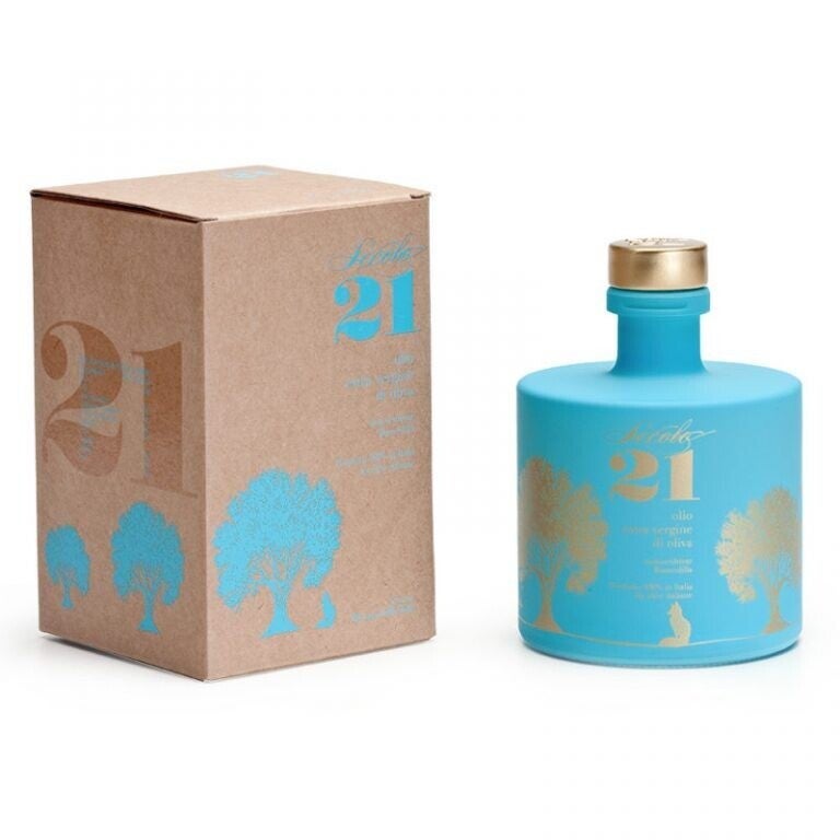 Biancolilla single-variant Extra Vergine olijfolie wordt gepresenteerd in een elegante blauwe fles die het beeld oproept van de ideale combinatie…vis.
