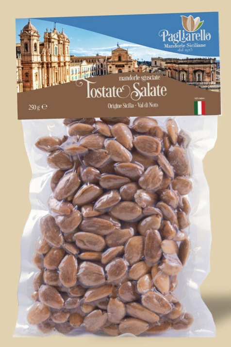 Amandelen van het type Val di Noto, gedopt, gepeld en geroosterd op lage temperatuur met toevoeging van zout. Met een onweerstaanbare smaak, uitstekend bij het aperitief.