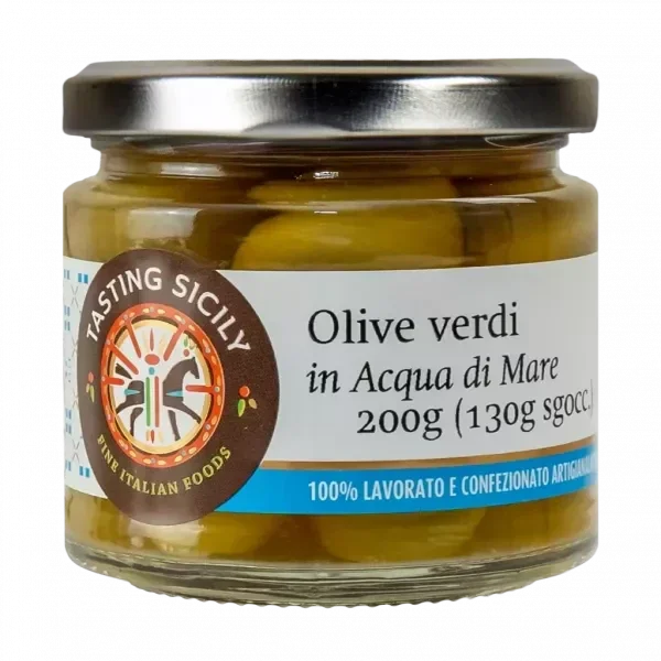 Groene olijven in zeewater: een natuurlijke conservering die de versheid verhoogt. De Middellandse Zee in elke olijf!