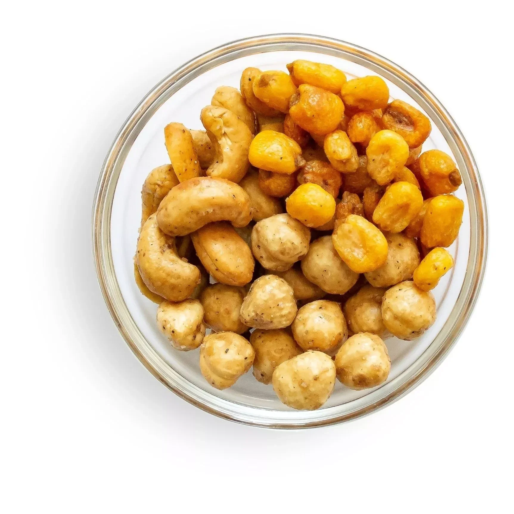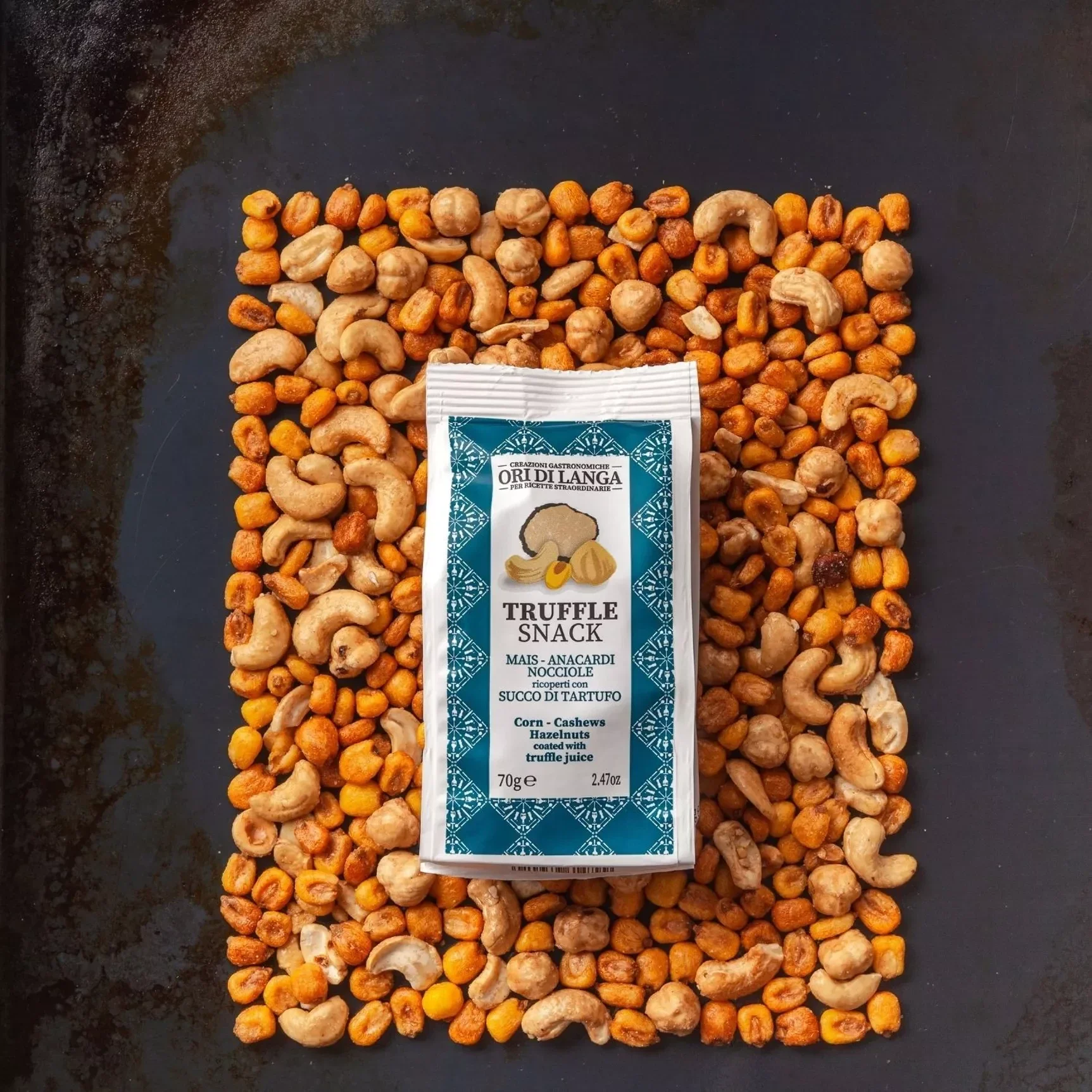 De Truffel Snack bestaat uit een mix van hazelnoten, maïskorrels en cashewnoten met truffel.
