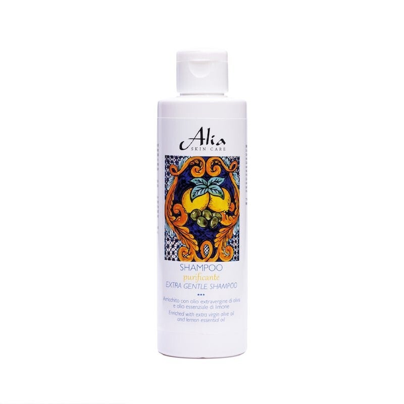 Alia Skin Care zuiverende & milde shampoo met extra vierge olijfolie, kamille en etherische olie van citroen. Hydrateert, verzacht en verfrist haar en hoofdhuid